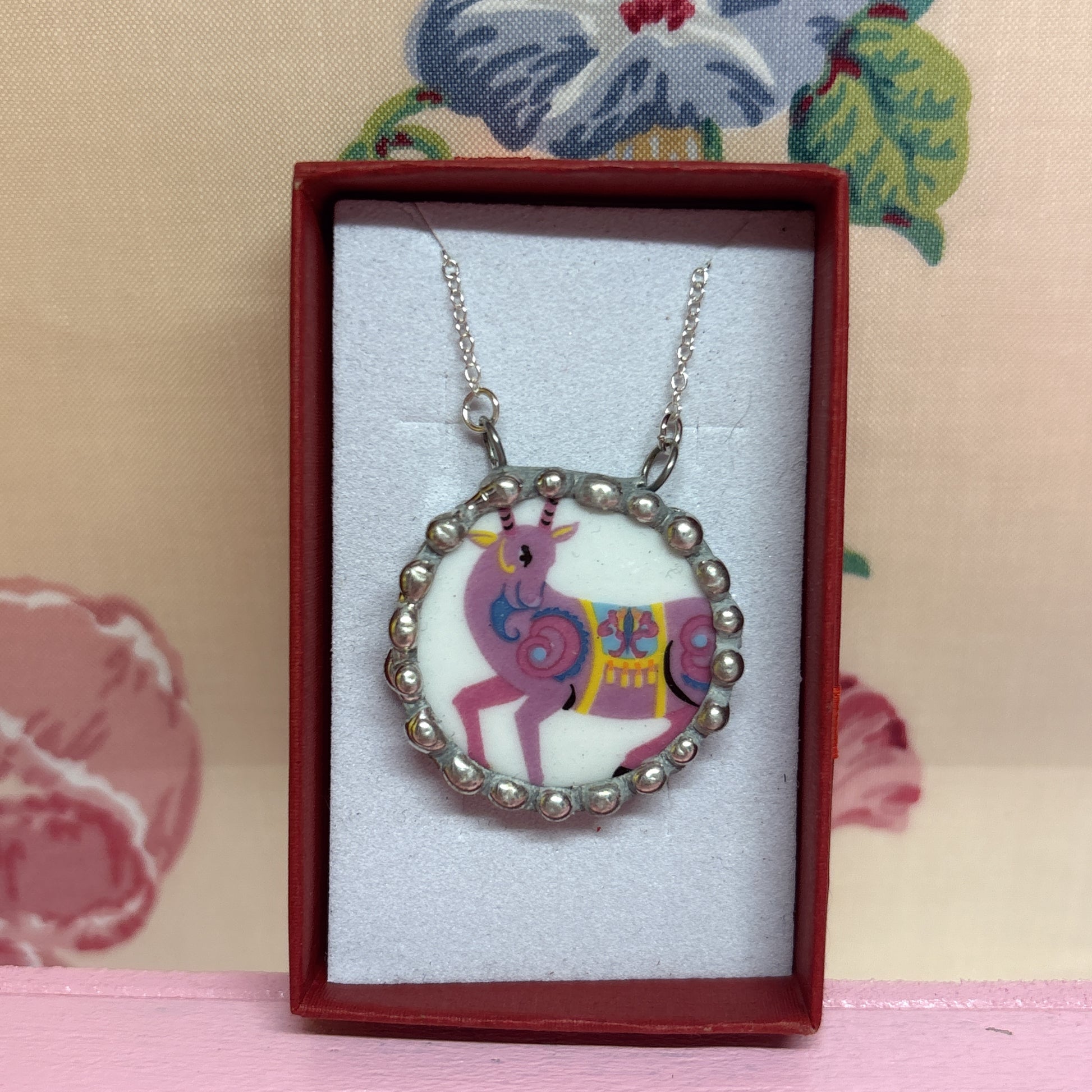 This necklace was handcrafted from a dinner plate featuring the Chinese Zodiac. This necklace is set in lead-free solder in dotted border. It measures at an inch and a quarter. This one of a kind necklace comes complete with an 18 inch classic chain.