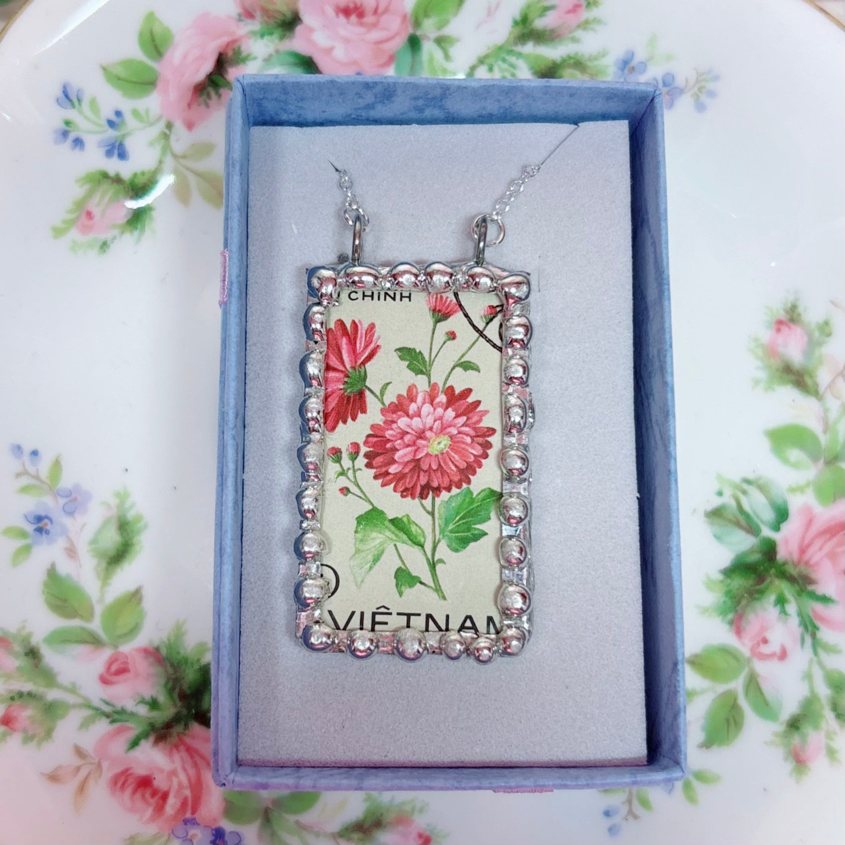This necklace is made from a 1978 stamp from Vietnam. It features a Chrysanthemum in dark pink. It measures just under two inches and is sandwiched between two pieces of glass. It is soldered with lead-free solder around the edges and comes with an 18 inch classic chain between two jumprings.